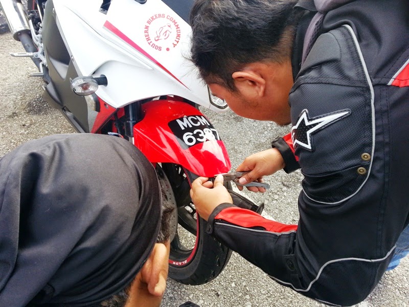 Nampaknya Ijat sedang menyelesaikan sedikit masalah dengan kondisi tayar depannya yang baru. Tayar ada sedikit sagat dengan mudguard bahagian depan. Tayar baru tu.. Tukar pun sebab nak ride Fukit Fraser. Hahaha..